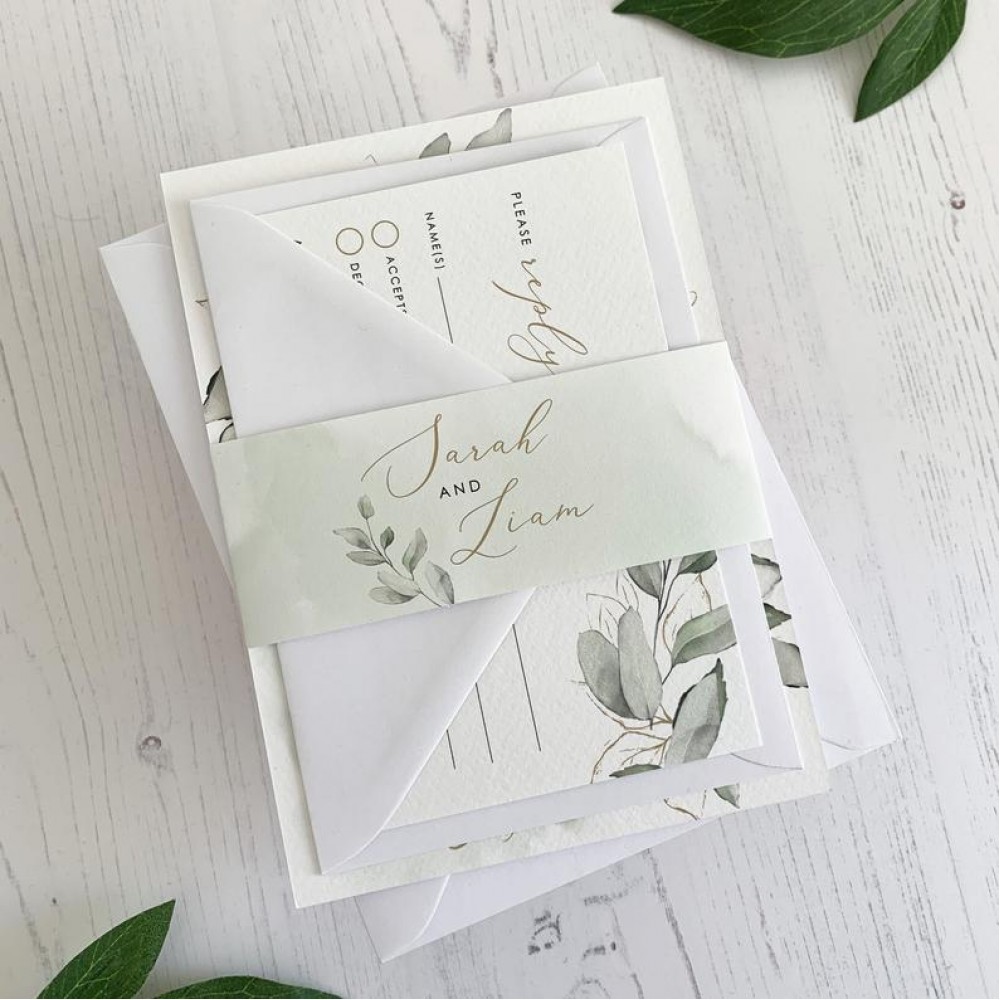 Green Wedding Invitation Set, Green Wedding Invitations with Belly band & RSVP, Botanical Leaf Eucalyptus Wedding Stationery Rustic Gold